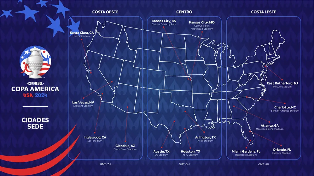A Conmebol anunciou as sedes da Copa América 2024 e o calendário do torneio, que será disputado nos Estados Unidos. Os jogos serão em 14 estádios diferentes, de 13 cidades por todo o território norte-americano. O Brasil conheceu a data e local de sua estreia: será no dia 21 de junho, no SoFI Stadium, em Inglewood, próximo a Los Angeles, na Califórnia.