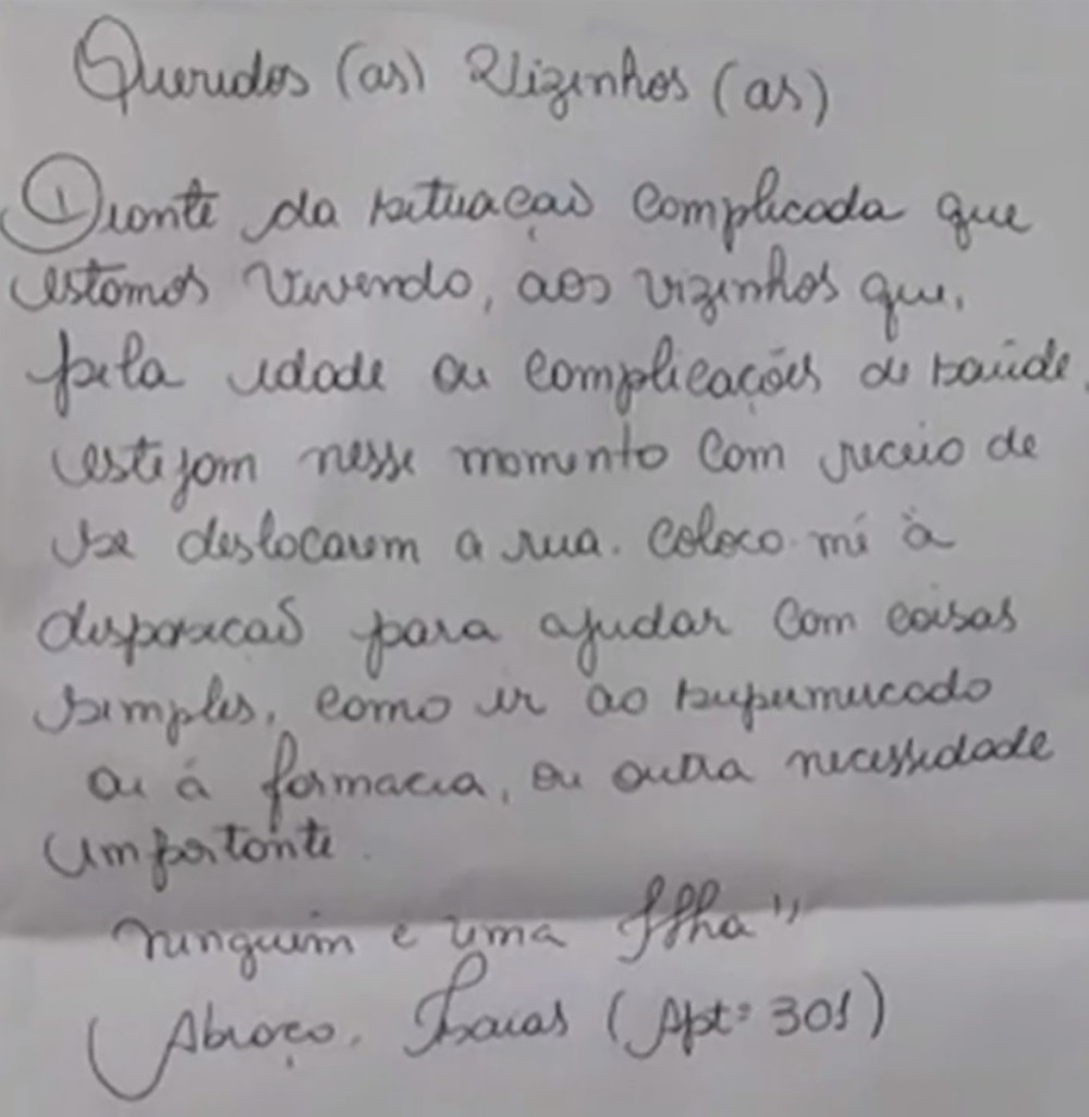 Na Bahia, um jovem de 26 anos se prontificou a comprar produtos e remédios para vizinhos idosos que precisam ficar em casa para evitar a contaminação pelo Covid-19. Ele escreveu um bilhete e espalhou cópias no condomínio onde mora.