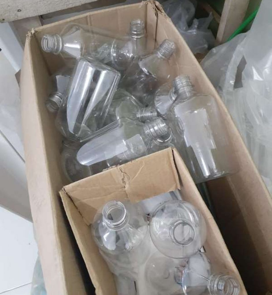 No local foram apreendidas três caixas com 80 unidades de álcool em gel suspeitas de adulteração; 13 caixas contendo 30 unidades de 500 ml de álcool em gel; sete caixas contendo 90 unidades de frascos vazios; 453 frascos vazios de 500 ml e 180 ml, além de um saco com diversas tampas para os tubos, sete recipientes de cloro, odorizador de tecidos e essência de âmbar.