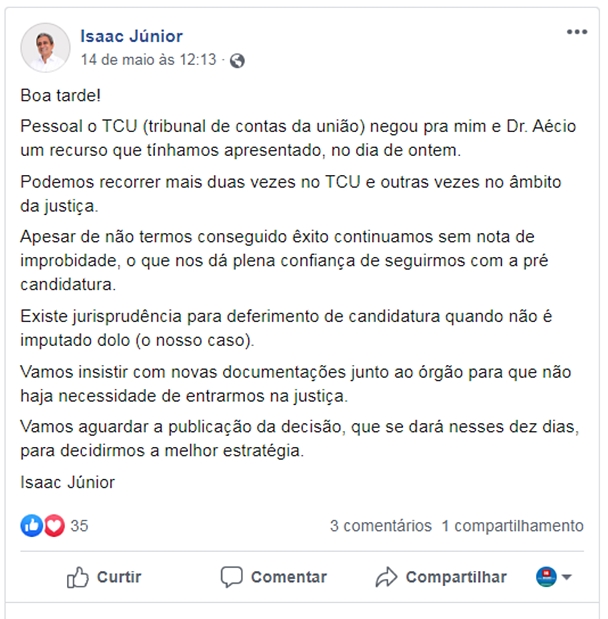 Mesmo com mais um recurso negado pela terceira vez, Júnior diz que mantêm a sua pré-candidatura a prefeito. Em uma de suas redes sociais ele diz que irá “insistir com novas documentações” e que a legislação consente a candidatura quando não há fraude (dolo) alegando, assim, ser o seu caso (abaixo segue a nota).