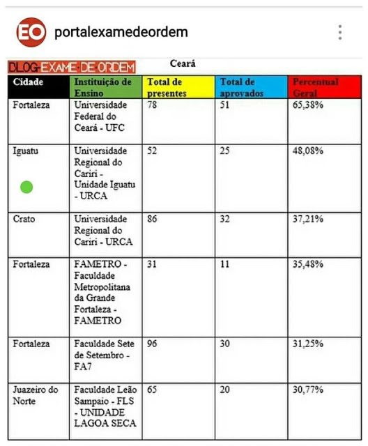 “O Curso de Direito da Unidade de Iguatu atingiu a marca de 48,08% de aprovação e o Curso de Direito de Crato alcançou a marca de 37,21% de aprovação. Percentual atingido no Resultado do Exame de Ordem divulgado recentemente”.