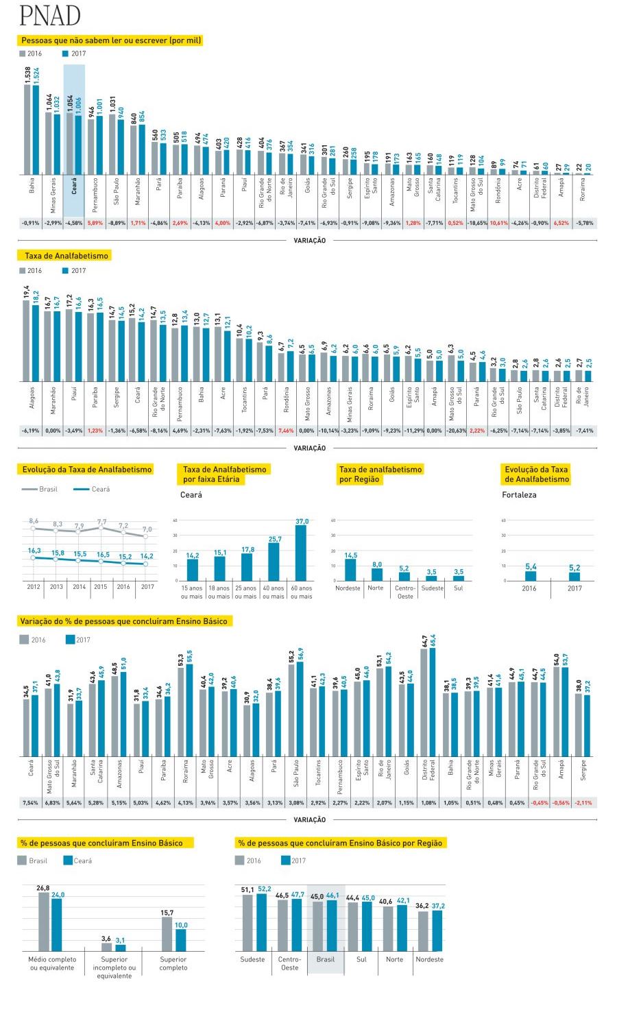Em termos relativos, o Ceará tem a 6ª pior taxa de analfabetismo do País, com 14,2%. Isso significa que uma a cada nove pessoas não sabe ler ou escrever. Os dados, referentes a 2017, são da Pesquisa Nacional por Amostra de Domicílios Contínua (Pnad) e foram divulgados ontem pelo Instituto Nacional de Geografia e Estatística (IBGE).