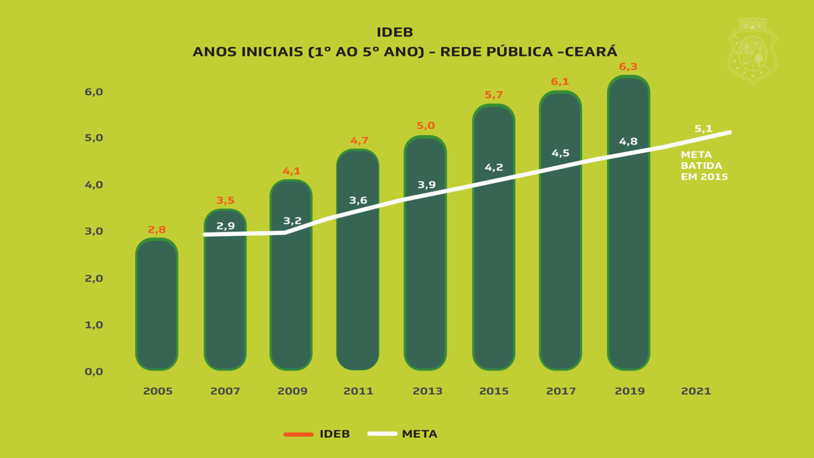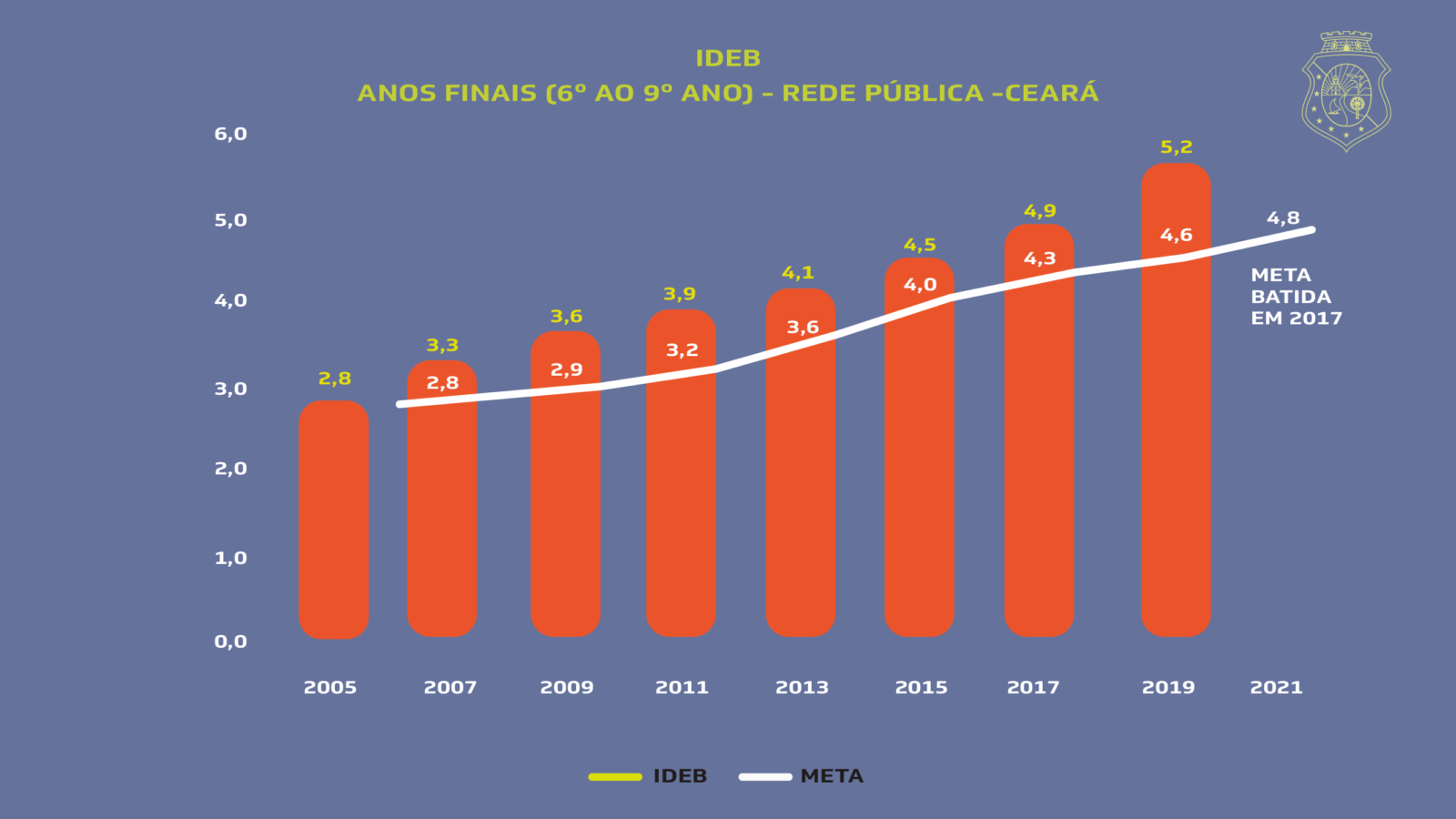 Ao longo dos últimos 14 anos, o Ceará segue avançando nesta etapa do Ensino Fundamental, conquistando a melhor evolução do Brasil no Ideb. Saiu de 2,8 em 2005 para 6,3 em 2019. Segundo o Instituto Nacional de Estudos e Pesquisas Educacionais Anísio Teixeira (Inep), o ritmo de crescimento é quase duas vezes superior à média brasileira, que, no mesmo período, passou de 3,6 para 5,7.