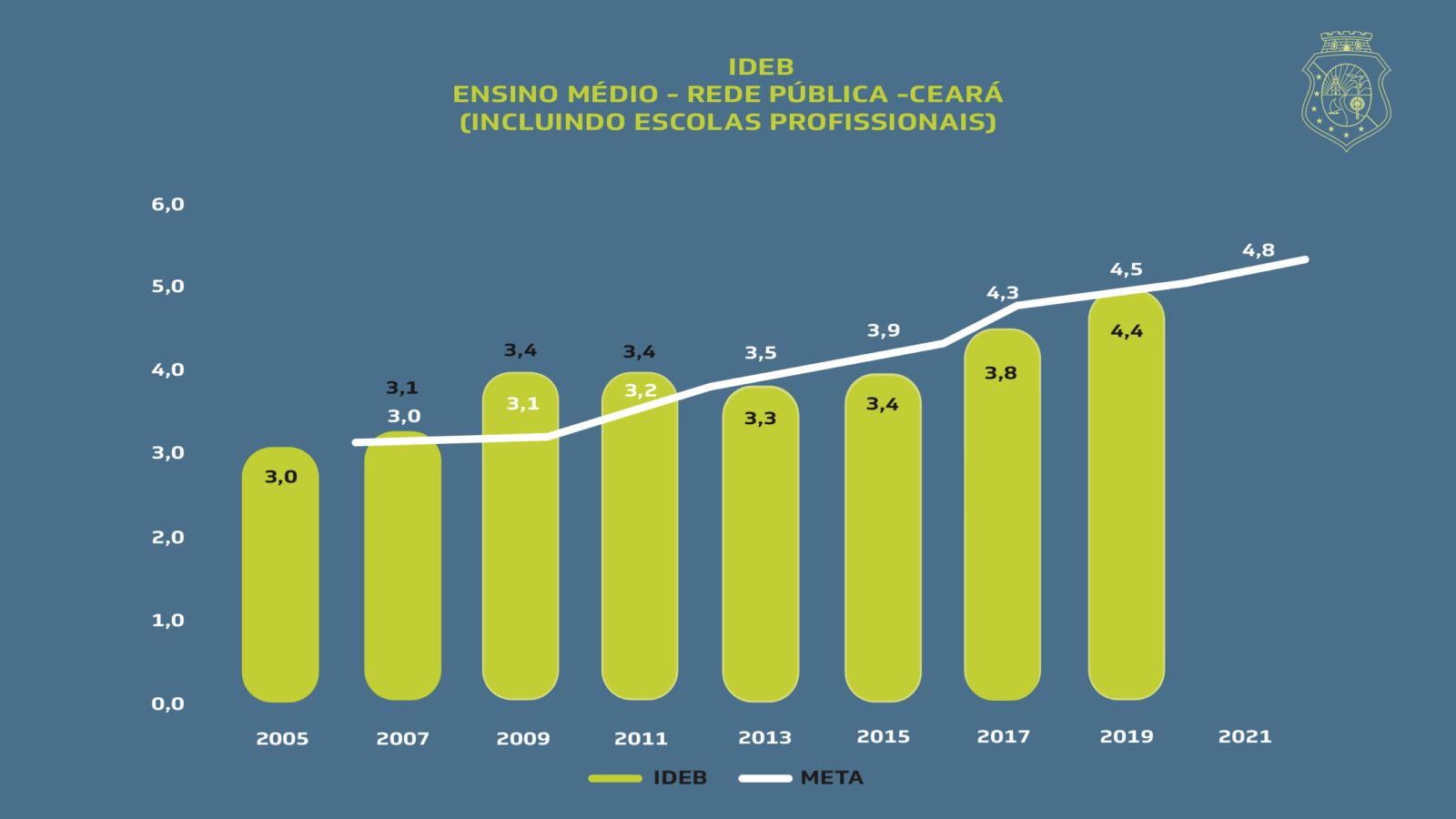 No Ensino Médio, a rede pública estadual do Ceará saiu de 3,8, em 2017, para 4,4 em 2019. O resultado demonstra uma aproximação da meta estipulada, que era de 4,5, deixando o estado em 4º lugar nacional e em segundo do Nordeste após Pernambuco (4,5).