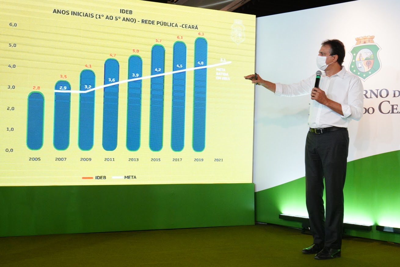 O resultado do Ideb da rede pública cearense foi apresentado pelo governador Camilo Santana durante live nas redes sociais nesta terça-feira (15). O evento contou, ainda, com as participações da vice-governadora Izolda Cela e da secretária da Educação, Eliana Estrela. Ainda de acordo com o principal indicador que avalia a qualidade da educação básica, o Ceará apresenta a melhor evolução nos anos iniciais do Ensino Fundamental (do 1º ao 5º ano) quando comparado às demais unidades da federação. A rede pública alcançou a nota 6,3 em 2019, superando em 1,5 ponto a meta estabelecida pelo Ministério da Educação (MEC).