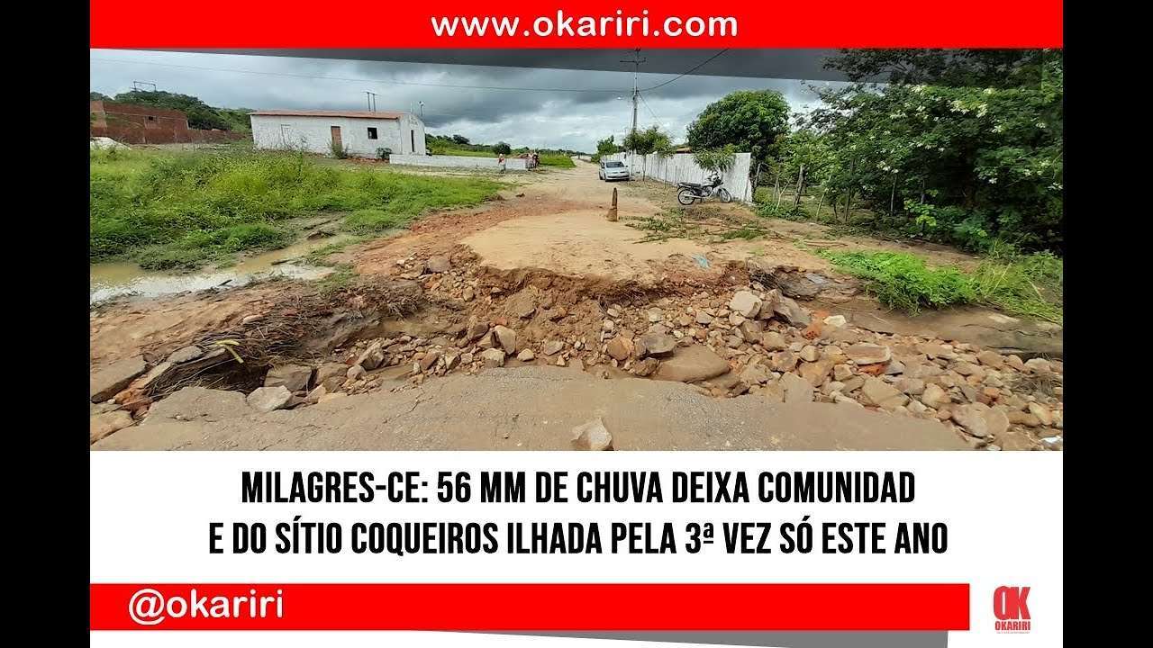 Devido a chuvas, a comunidade do Sítio Coqueiro em Milagres-CE fica ilhada pela terceira vez este ano. Uma rachadura próxima à antiga “Casa de Apoio”, que está localizada bem no início do lugarejo deixou a estrada intransitável neste domingo (24.04).