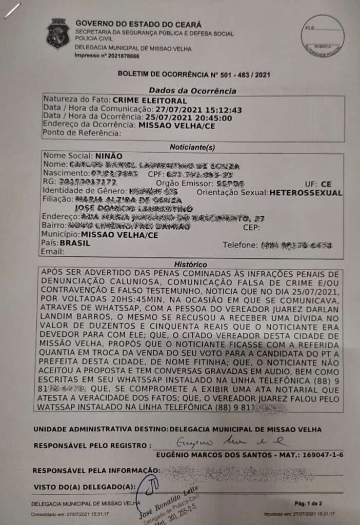 A denúncia de um áudio atribuído ao vereador Juarez Barros Landim (MDB) de Missão Velha repercutiu nessa quarta-feira (28.07). Nele, o parlamentar estaria negociando uma compra de voto para candidata a prefeita Fitinha (PT) – Veja a foto do B.O abaixo da matéria.