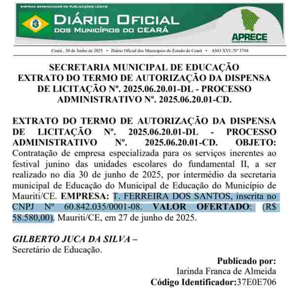 Segundo apurado pelo Portal OKariri, a Secretaria de Educação contratou, por dispensa de licitação, a empresa T. Ferreira dos Santos (CNPJ 60.842.035/0001-08), no valor de R$ 58.580,00. A contratação foi publicada no Diário dos Municípios em 30 de junho de 2025, mesma data do evento.