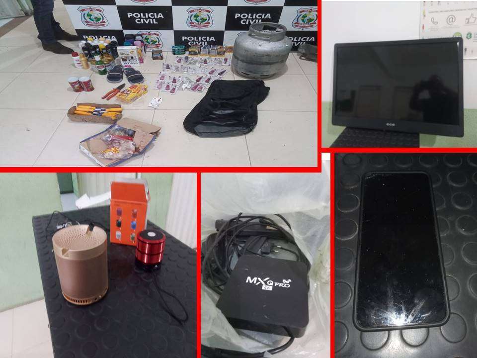 Na residência foram encontrados vários produtos que podem ser dos furtos, tais como: um condicionador, um kit de shampoo, algumas bebidas alcoólicas, uma mochila, um receptor mídia box, um aparelho de TV, duas caixas de som portátil, vinte e unidade de desodorante, três hidratantes, um sabonete líquido, vinte e seis vidros de esmalte, uma caixa de chocolate, duas latas de achocolatado, três latas de sardinha, um botijão de gás de cozinha, uma par de sandálias, uma lata de fiambre, onze chaves de fenda, além de dezoito carteiras de Cigarros.