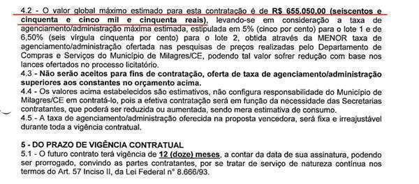 A Prefeitura de Milagres-Ce, estima gastar ao menos R$ 655 mil do dinheiro do contribuinte com despesas de passagens em 2022. Conforme o processo licitatório, divulgado no site de licitações, a gestão está visando contratar empresa prestadora de serviços de agenciamento de viagens. A disputa do certame deverá acontecer um dia antes da Comemoração da Independia do Brasil, na terça-feira (06/09).