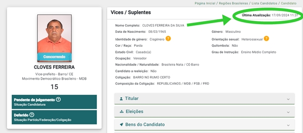 Agora é oficial, o nome do candidato Cloves Ferreira da Silva (59 anos), já aparece nos registros da justiça...