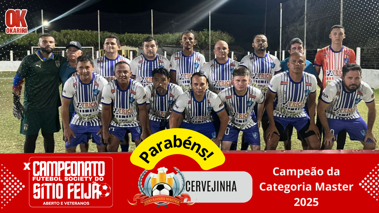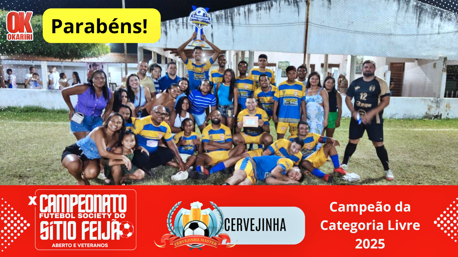 O Cervejinha, na categoria Master, e o Sevilla, na categoria Livre, são os grandes campeões da 10ª edição do Campeonato de Futebol Society do Sítio Feijão, promovido por Cícero Horácio e família. O evento, que teve início em 5 de julho, contou com a participação de 35 equipes, divididas entre 16 times na categoria Master e 19 na categoria Livre, e culminou em uma noite emocionante de grandes jogos, realizada no último sábado, 8 de novembro de 2025 (assista à partida no vídeo abaixo).