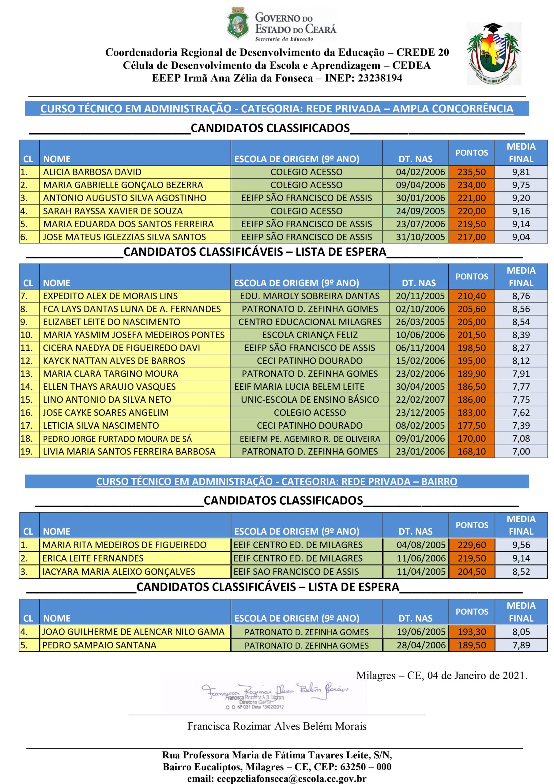 A Diretora da Escola Estadual de Educação Profissional Irmã Ana Zélia da Fonseca, de Milagres-CE, Rosimar Belém tornou público o resultado do processo de seleção de alunos novatos para a 1ª série do Ensino Médio Integrado à Educação Profissional para os cursos técnicos em Administração, Agronegócio, Enfermagem e Informática para ingresso no ano letivo de 2021.