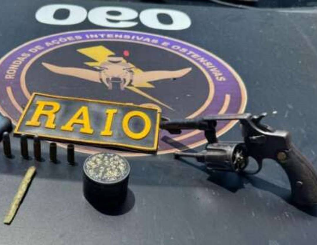 Na pochete foram encontrados um revólver calibre 32 com numeração suprimida, duas munições deflagradas, três munições intactas, um triturador de maconha e um cigarro de maconha feito.