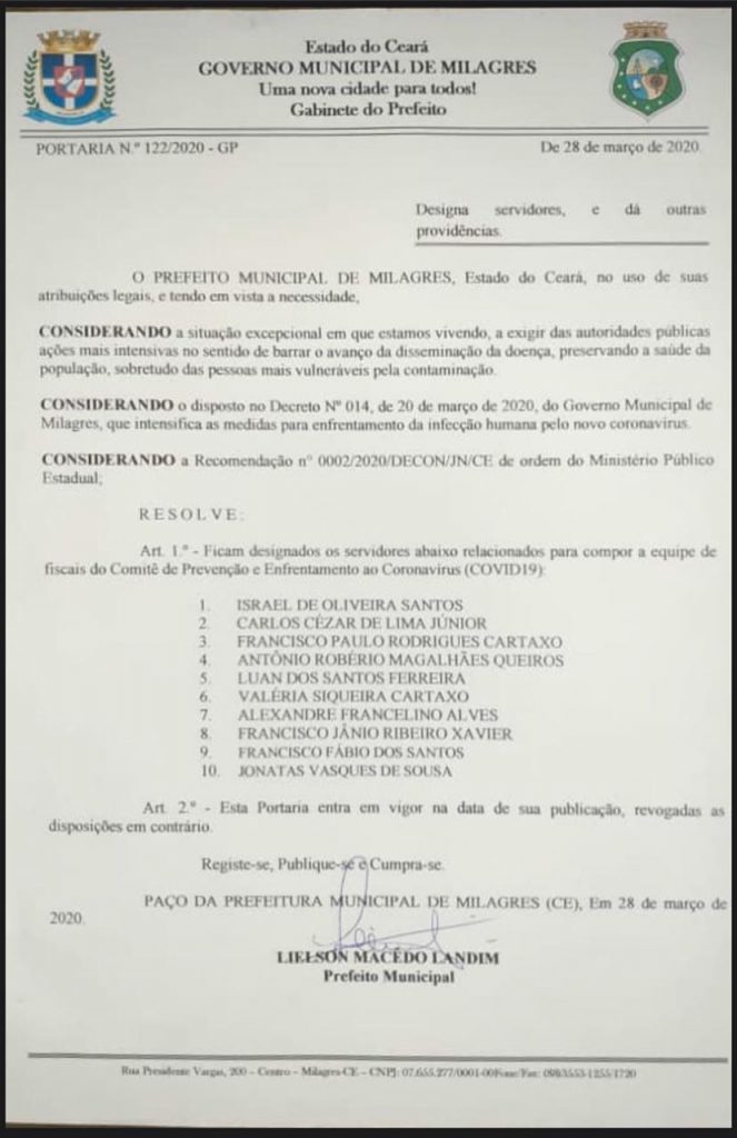 O Governo Municipal de Milagres publicou portaria de nº 122/2020, designando servidores do município para compor equipe de fiscalização do Comitê de Enfrentamento ao Coronavírus. As ações são justificadas pela necessidade de ações mais rígidas, por parte das autoridades públicas, no sentido de barrar o avanço e disseminação da doença.